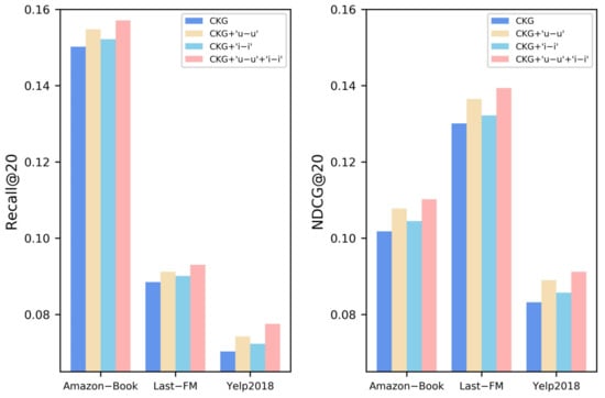 It can be seen in Figure 7 that the collaborative knowledge graph with user–user or item–item connection edges had a more significant effect than the original CKG, and the effect of adding user–user edges alone was better than adding item–item edges alone, reflecting the interest preference of modeling users and depicting the similarity between users, which is more effective than commodity similarity. The collaborative knowledge graph with user–user and item–item connection edges, at the same time, had the best effect, as shown in the red histogram above.