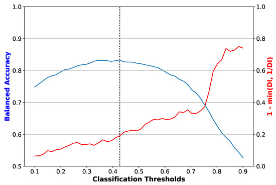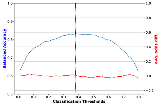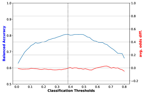 Each of our classifiers output a continuous prediction for each test data point. We converted these to binary classifications by comparing with a classification threshold. Figure 2, Figure 3, Figure 4, Figure 5, Figure 6 and Figure 7 show the trade-off between balanced accuracy and fairness metrics as a function of the classification threshold. Figure 2 and Figure 3 show how the disparate impact error and average odds difference vary together with the balanced accuracy as a function of the classification threshold of a logistic regression model with no bias mitigation, for one of the folds of cross-validation. The corresponding plots for the random forest classifier show the same trends. The performance and fairness metrics after cross-validation are shown in Table 4 and Table 5, respectively. Since we observed bias (see Section 4 for further discussion), we implemented the mitigation strategies detailed in Section 2.4. Figure 4 and Figure 5 show the validation plots for a logistic regression classifier with reweighing for one of the folds of cross-validation; the plots for the random forest classifier show similar trends. Figure 6 and Figure 7 show the validation plots for a logistic regression classifier with prejudice remover.