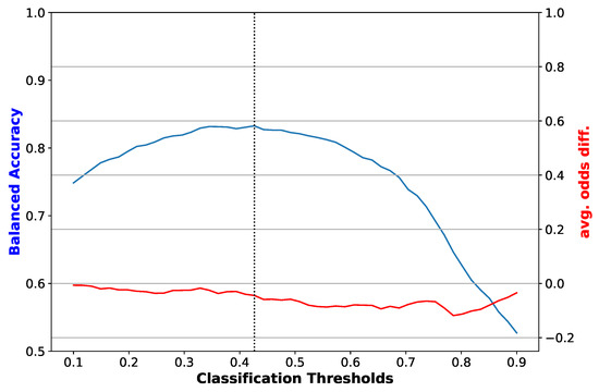 Balanced accuracy and average odds difference versus classification threshold for a logistic regression classifier with no bias mitigation. The dotted vertical line is the threshold that maximizes balanced accuracy. The plot shown corresponds to one of the folds of cross-validation.