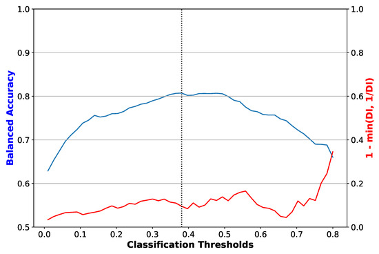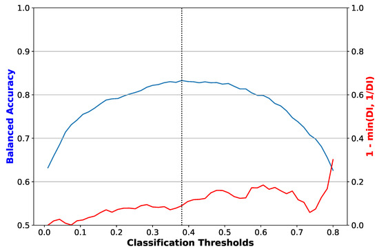 Balanced accuracy and disparate impact error versus classification threshold for a logistic regression classifier with reweighing. The dotted vertical line is the threshold that maximizes balanced accuracy. The plot shown corresponds to one of the folds of cross-validation. Disparate impact error, equal to 1-min(DI, 1/DI), where DI is the disparate impact, and the difference between disparate impact and its ideal value of 1.