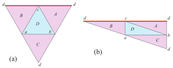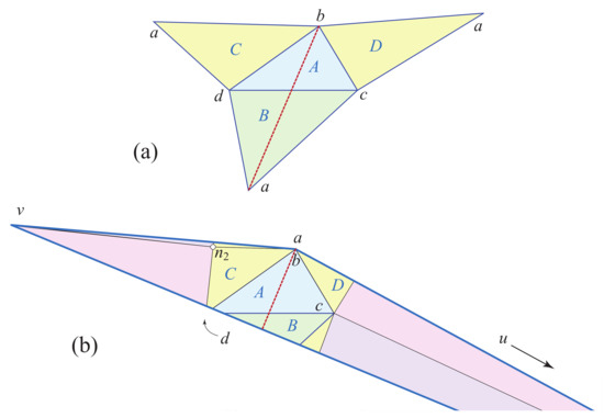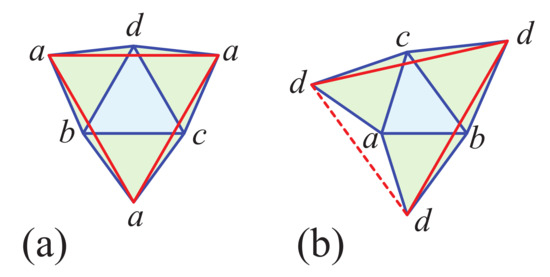 Figure 16. Two star unfoldings of a near-regular tetrahedron. In this example, and . Geodesic loops are solid red segments. In (a), each loop has angle to one side of a and to the other side. In (b), , so the loops are quasigeodesics. - Because N is chosen sufficiently close to a regular tetrahedron, Lemma 9 shows that every edge of N provides three non-degenerate s, as in Figure 17. The three vertices of curvatures provide three more degenerate ’s. They all sum up to s;