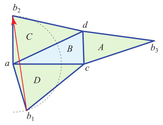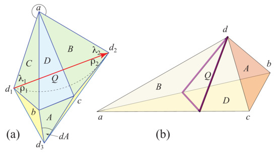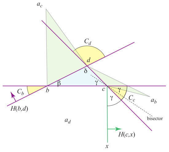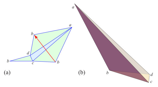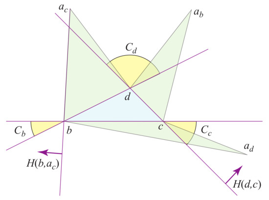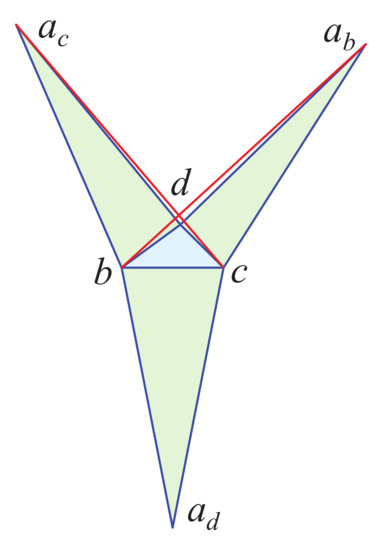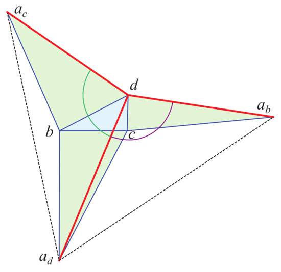 Refer to Figure 2. Here we use the second form of Gauss–Bonnet. Let Q be a 1-vertex quasigeodesic through vertex d, with a and b strictly to Q’s left, and c strictly to Q’s right. Since , Q must have no turn, , to its left at d, and turn to its right at d. Having no turn to its left means the total angle of is to the left of Q at d. Turning to the right means that Q turns around completely, folding back on itself, which then forces Q to contain vertex c. Thus, c does not lie strictly to Q’s right: Q is a 2-vertex quasigeodesic, not a 1-vertex quasigeodesic. □