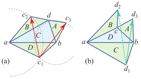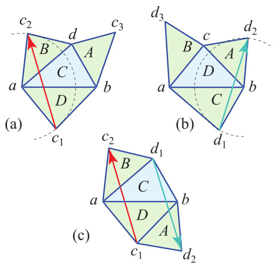 As illustrated in Figure 7a, just as in Case 1, because c is closest to both a and b, there exist geodesic loops at c such that separates a from and separates b from : vertex d cannot interfere with either nor .