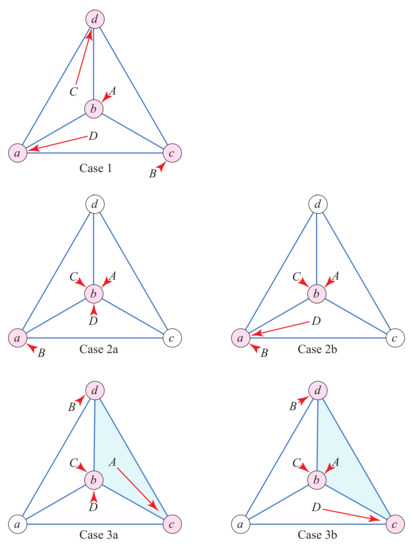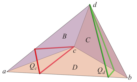 In contrast to Case 3a, in this case, one of the faces that fail on b is the three-vertex face A. (Swapping B to fail on c, D to fail on b, and C to fail on d, is symmetrically equivalent.) This is the only difficult case, and the only case in which the triangle inequalities guaranteed by Lemma 5 are needed.