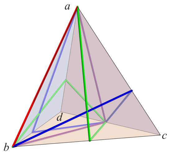 To see this, assume the isosceles tetrahedron T admits a geodesic loop at its vertex a. Star-unfold T with respect to a, resulting in an acute triangle . The star-unfolding is discussed in Section 4.2. It cuts the three edges incident to a. Tile the plane with . In that tiling, corresponds to a segment joining two images of a, say and . However, and are determining either a side or a diagonal apexed at images of a. In both cases, would contain the image of another vertex of T, showing that necessarily passes through the respective vertex.