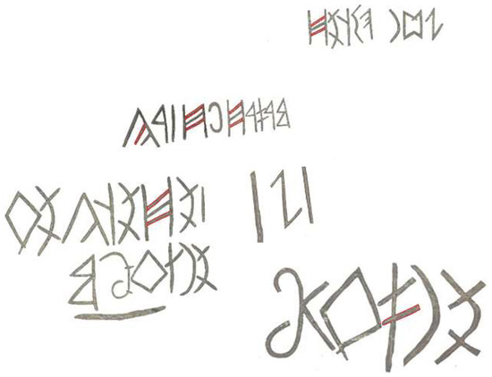Sartkožauly [1] gave a drawing of the inscription. Figure 1a is a modification of that drawing by enhancing it with different colors for the inscription itself and the underlying animal drawings. This distinction is important because it influences the interpretation of the signs that are thought to belong to the inscription. In fact, we do not completely agree with Sartkožauly’s identification of what belongs to the inscription versus the underlying drawings.