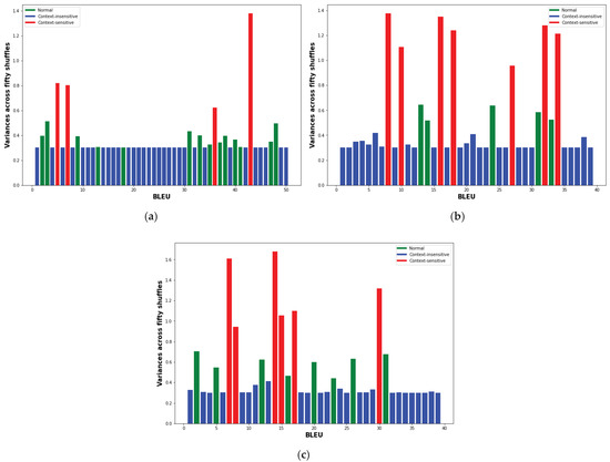 We also show the variances obtained for BLEU in Figure 3a–c, for Hindi-to-English, Spanish-to-English and Chinese-to-English, respectively. The green, blue and red bars represent normal, context-insensitive and context-sensitive sentences, respectively. The figures clearly separates distributions of sentences over the three classes.
