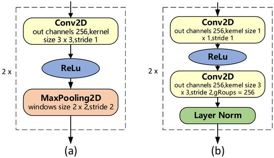 (a) The structure of the convolution subsampling layer. (b) The structure of the subsampling layer replaced with depthwise separable convolution.