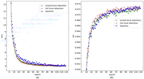 Figure 5a shows that, after 120 training iterations, the loss value starts to oscillate, indicating that the neural network model converged after training. After adding local attention, the loss of the validation set is lower than that of the baseline throughout the training process, and the change in the loss curve is smoother than that of the baseline. This indicates that, when adding a local attention mechanism to the model, the model obtains a more accurate gradient descent direction during training.