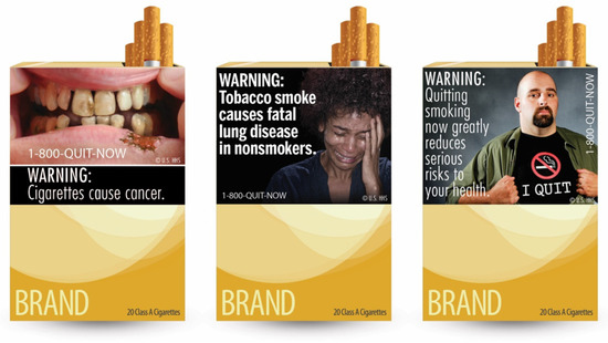 - U.S. Food & Drug Administration. FDA Proposes New Required Health Warnings with Color Images for Cigarette Packages and Advertisements to Promote Greater Public Understanding of Negative Health Consequences of Smoking. Available online: https://www.fda.gov/news-events/press-announcements/fda-proposes-new-required-health-warnings-color-images-cigarette-packages-and-advertisements-promote (accessed on 1 March 2022).