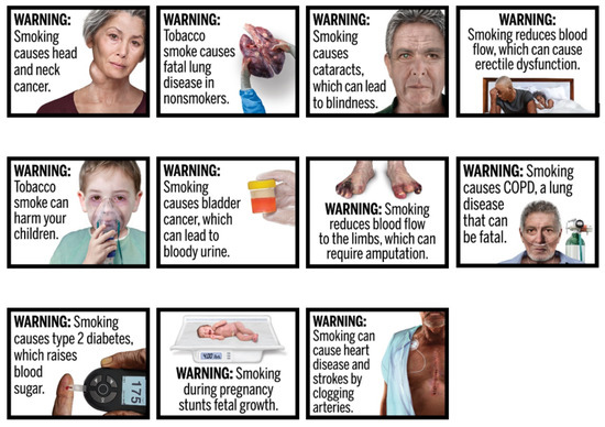 - FDA Label Imaegs. Available online: https://web.archive.org/web/20120302084657/http://www.fda.gov/downloads/TobaccoProducts/Labeling/CigaretteWarningLabels/UCM259974.zip (accessed on 1 March 2022).