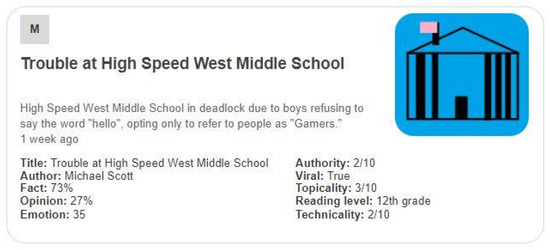 The study of the perceptions of university members on online media labeling compared two demographically diverse university communities within the United States. It included questions relating to participants’ views regarding multiple label categories (including those proposed by Fuhr et al. [23]). These categories included the article’s title, publisher, publication date, author, sponsors, author’s political affiliations, the sponsor’s political affiliations, the publisher’s political affiliations, writing quality, topic virality, topic controversy level, the reading level and the use of field-specific technical statements. It also gauged respondents’ perspectives on and receptiveness to several labeling styles that were previously [9] developed.