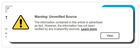 The United States’ 2016 and 2020 presidential elections were instructive in this regard. Trends regarding the spread of misinformation surrounding the election on Twitter and other social media sites were analyzed [13,67]. Perhaps in response to this, numerous social media platforms, such as Facebook, Twitter, Instagram and YouTube, began labeling social media posts and videos in the run-up to the 2020 United States Presidential Election to combat the spread of misinformation surrounding the candidates, rules about in-person and mail-in voting and the election results themselves [68,69]. A public dataset of over one billion “tweets” (Twitter posts) was released, initially from 1 December 2020 through 22 January 2021 but later expanded to include earlier and later tweets [70]. A separate study [71] of tweets from 1 November 2020 through 8 January 2021 from the Twitter account of former United States President Donald Trump was conducted, covering the days before the 2020 election up until the date that Donald Trump’s account was suspended by Twitter. During this period, Twitter flagged numerous tweets from the former President as containing misinformation, disinformation or mal-information related to the 2020 election. These flags appeared as a content label viewable to Twitter users. In some cases, called “hard intervention” by the authors, the original tweet was unable to be liked or replied to and was concealed behind the label, requiring the user to click a button to view the content after reviewing the warning regarding the misinformation. Other “soft interventions” provided a warning as to the content being misleading but did not prevent the tweet from being interacted with or covered behind the “view” button.