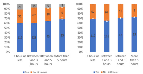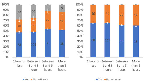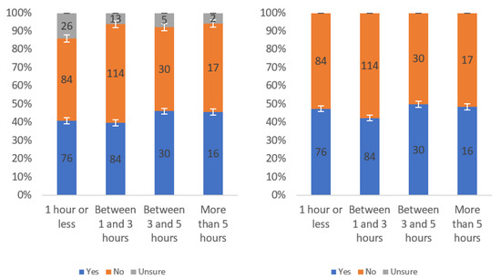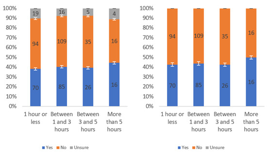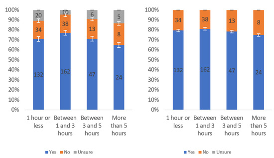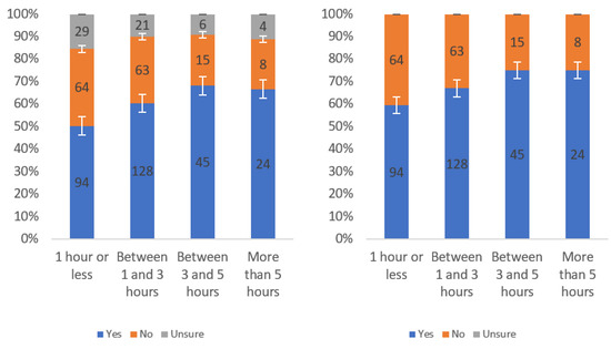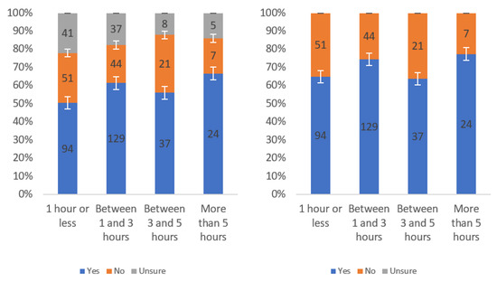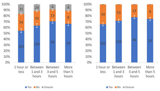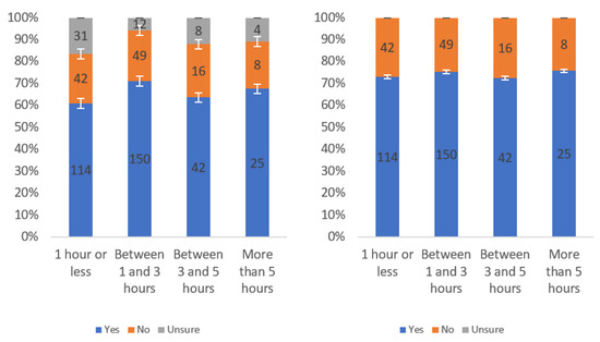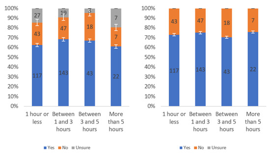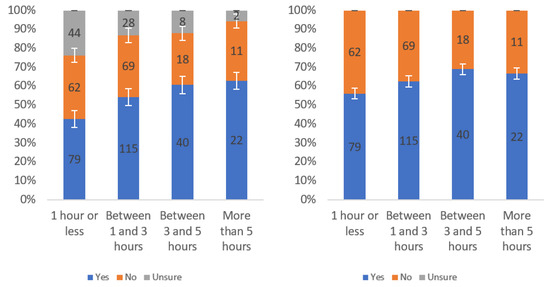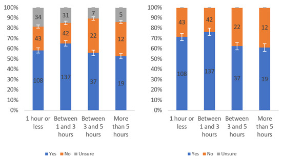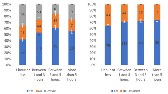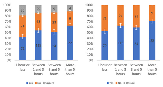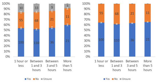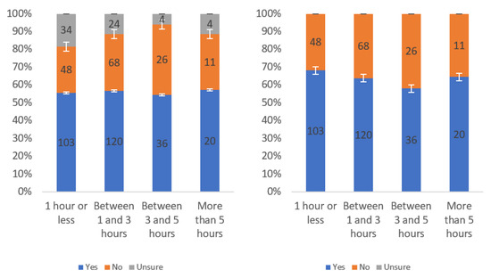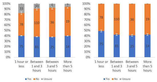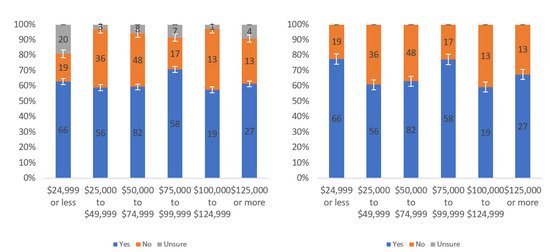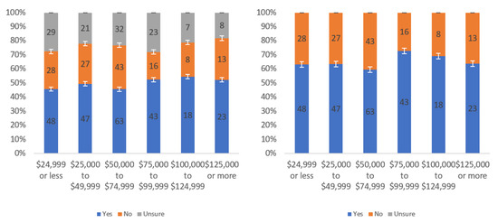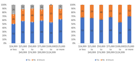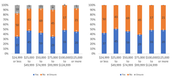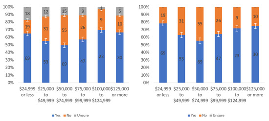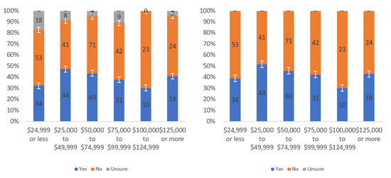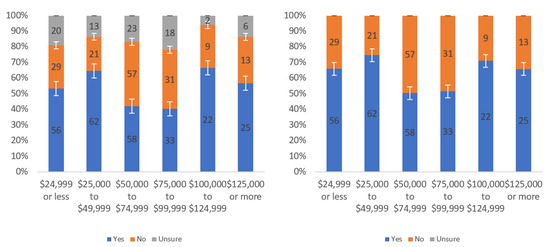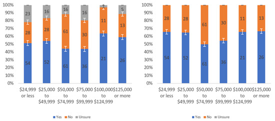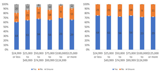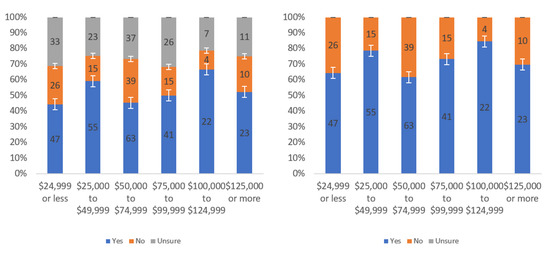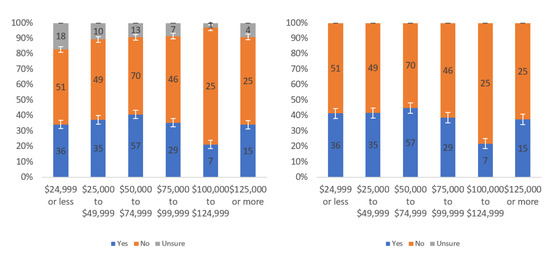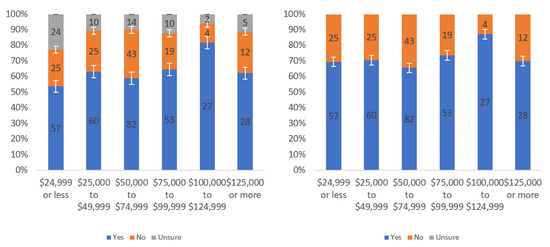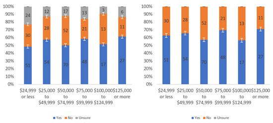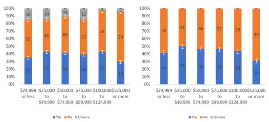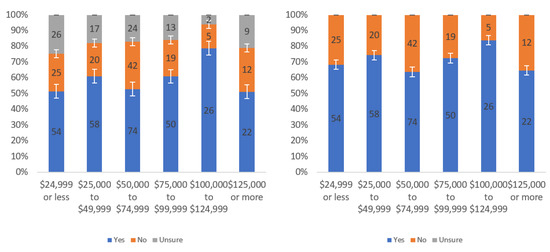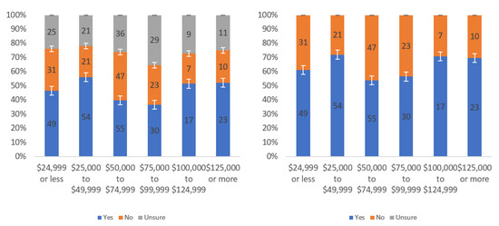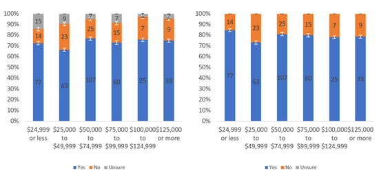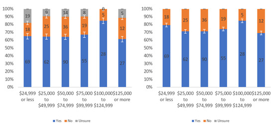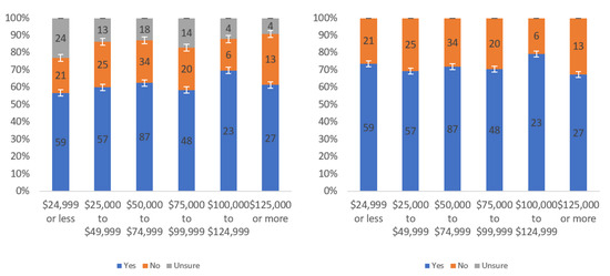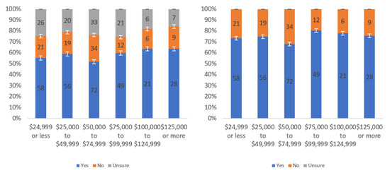 Figure A1 shows that most respondents, who had an opinion, found the labels to be helpful. The level of uncertainty fluctuated notably by income level, with the greatest numbers of individuals reporting being unsure at the lowest, highest and USD 75,000–99,999 income levels. When considering only “yes” and “no” responses, a trend of a slight decline in perceived helpfulness with increasing income level is shown in Figure A1 (right). Overall, though, there was not a tremendous difference between perceived helpfulness across different income levels. It is notable that there was an increase in perceived helpfulness between the USD 50,000 and USD 75,000 income levels. This trend was also present in the data for some other questions related to other labels.