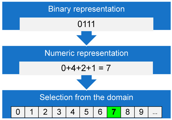 Exemplary selection from the domain 0…15 by 4 bits of digital information. The binary coding and the meaning of each possible number 0…15 must be clear to the participants of the digital communication.