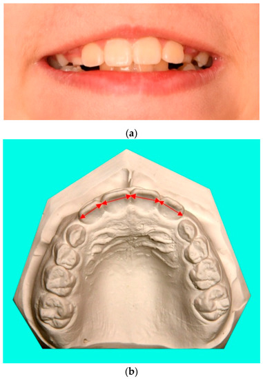 Figure 2. (a) Correction and preservation of the position of the incisors is part of the orthodontic treatment goals. The dentition model of this patient is shown in (b). The red arrows show the sum of the incisor widths. This is used to estimate their space requirements and is an example of an orthodontic measurement. Many such data (number sequences) must be combined for diagnosis and treatment planning. Globally defined data enables direct global comparison and efficient exchange of experience. More details about medical applications are available in former publications (e.g., [5,7,10]).