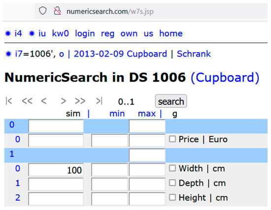 Example of a search for cupboards with 100 cm width. The numbers “Price, Width, Depth, Height” were defined as relevant (searchable and comparable) features of a cupboard. These 4 numbers select from a 4-dimensional domain. We can select another domain definition by clicking on “* i7” and view the defined DVs by clicking on “* i4”. Open data of the users are viewable after clicking on “* iu”.