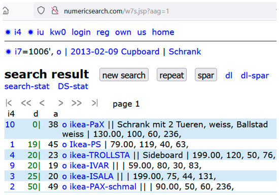 Search result after search input of Figure 3. The smaller the absolute difference (d) of the width from 100 cm, the higher the rank in the search result. Therefore, the cupboards whose width (2nd number) is closest to 100 (with the smallest distance (d) from 100) are listed first. Globally (online) defined DVs (1) would allow global searches.