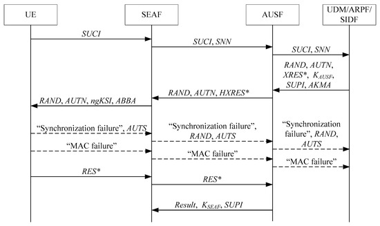 In step 11, if is not in the correct range, then the USIM computes , and sends with a “Synchronization failure” indication to the ME, where denotes the highest sequence number the USIM has accepted, , , is a dummy value of all zeros, is a message authentication function, and is a key-generating function. Then, the UE sends with a “Synchronization failure” indication to the SEAF. Further, the SEAF sends and with a “Synchronization failure” indication to the AUSF. Finally, the ASUF sends and with a “Synchronization failure” indication to the UDM/ARPF.