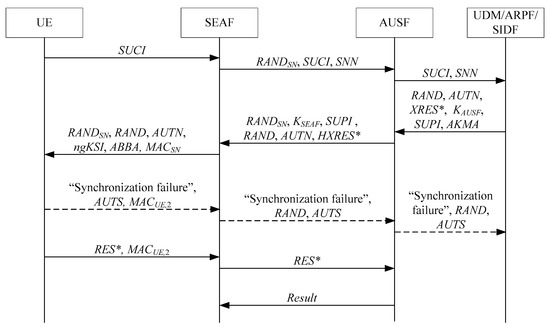 In step 11, if is not in the correct range, then the USIM computes , and then sends with a “Synchronization failure” indication to the ME, where and . Then, the ME computes , and then sends and with a “Synchronization failure” indication to the SEAF, where . Further, the SEAF verifies . If the verification fails, then the SEAF aborts, otherwise the SEAF sends and with a “Synchronization failure” indication to the AUSF. Finally, the ASUF sends and with a “Synchronization failure” indication to the UDM/ARPF.