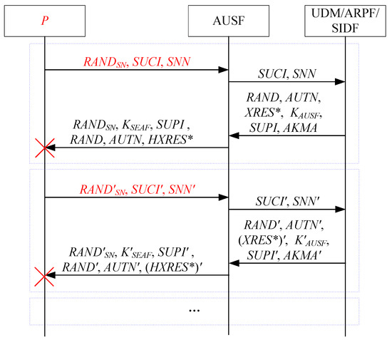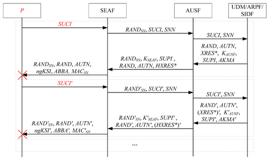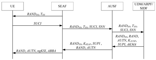 With the continuous popularization of 5G communication technology, in the near future, the 5G network, as an important communication infrastructure, will penetrate diverse vertical fields, such as the transportation and medical treatment industries, and will also support various information interactions between people, people and things, and things and things [1]. In the 5G network, three different primary authentication and key agreement protocols are defined in the related third-generation partnership project (3GPP) specifications [2,3,4], including the 5G authentication and key agreement (AKA) protocol, the improved extensible authentication protocol method for third-generation authentication and key agreement (EAP-AKA’), and the 5G extensible authentication protocol method for transport layer security (EAP-TLS). The first two protocols are based on the shared key cryptography, while the last one is based on the public key cryptography. These protocols all aim to provide mutual authentication of subscribers and networks. Currently, they are in the process of standardization.