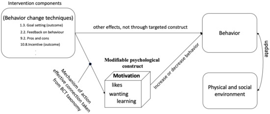 - Connell, L.E.; Carey, R.N.; de Bruin, M.; Rothman, A.J.; Johnston, M.; Kelly, M.P.; Michie, S. Links Between Behavior Change Techniques and Mechanisms of Action: An Expert Consensus Study. Ann. Behav. Med. 2018, 53, 708–720. [Google Scholar] [CrossRef] [PubMed] [Green Version]