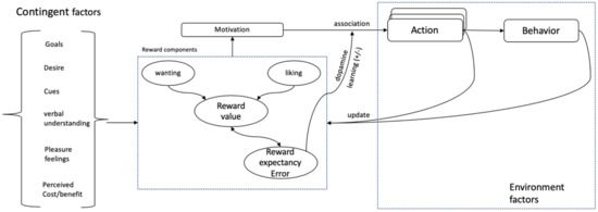 To summarize, we will use Equation (2) to generate motivation and Equation (4) to regulate or maintain the motivation. Figure 2 shows the schematic representation of the whole motivation process and the links of its components with other components in behavior change intervention.