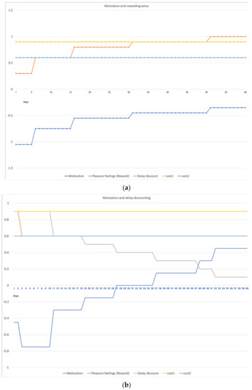 The hypothesis that motivation is generated through value-based reward anticipation can be observed by the intensity of the behavior for which an incentive is given. According to Equation (2), motivation is directly proportional to the difference between the expected reward and the cost of getting this reward. So this means that there could be several reasons that cause the difference in motivation level, and different techniques can be used to overcome these reasons. Firstly, let us consider how incentives can change the behavior, as the technique “10.8 incentive (outcome)” is the promise of external reward for performing a specific behavior. We keep the delay discounting and cost associated with the behavior constant (delay discounting 0.9, cost1 0.9, cost2 0.6), because we are giving them an incentive to increase the pleasure feeling; in other words, we are making the behavior rewarding for them. According to Equation (3), if the participant starts liking the incentive, it will increase their motivation to perform the behavior more often and achieve the reward again and again. Figure 3a shows how giving incentives during the intervention program increases the pleasure feeling (liking) and how motivation started building. This simulation gives us two insights; first, we can use incentives or other techniques to increase the pleasant feeling. Second, we can make these techniques adaptive according to different personalities. Next comes the subjectivity issue; maybe some employees will not consider points and badges as rewarding compared to the cost associated with them. We will show it with a difference in delay discounting value to simulate variability in different personalities. The health consequences of not living an active life are high (0.9), and doing daily physical activity has a moderate level of fatigue cost (0.6). Using the technique “5.1 information about health consequences,” we can target the delay discounting of the associated costs. In Figure 3b, suppose all of them like it equally, but the difference in their discount rate for the related costs would make a difference in their motivation level. The employee with the highest discount rate does not know or care about the health consequences and fatigue associated with actions. So, giving awareness or information about health consequences can target the delay discounting parameter.