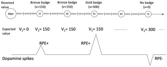 The scenario to understand RPE calculation is depicted in Figure 4. In our design, RPE is calculated using Equation (4). The expected reward on the fifteenth day was 150 points; the positive reward prediction arose because it was the first time. Later, on the 30th day, the expected and received reward were the same and did not cause any dopamine spike because the participant learned the behavior and its outcome. The participants will wish for a bronze medal again on day 45th, and surprisingly, getting a gold badge will produce high dopamine spikes. On the 75th day, the participant expected a gold medal again (worth 300 points), but surprisingly he got no reward which means he does not meet the actual reward expectation; according to Equation (4), 0–100 = −100. This negative reward prediction error would cause the update of the reward value of the action to 0 and would be less likely to perform again.