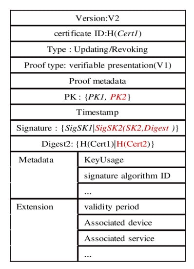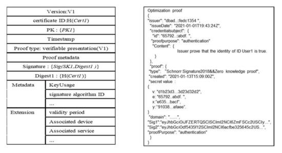 The user creates a self-signed certificate that contains a certificate ID, public key, signature, proof version, certificate version, timestamp and metadata. The certificate ID is defined as a hash of the certificate content, which can be used to ensure the integrity of certificate data. Key pairs (PK, SK) and signature values are generated locally by the user. The metadata contain information needed for the security functions, such as key usage or a signature algorithm identifier. Users can also add additional information according to their own needs to increase the functions expressed by the certificate. Meanwhile, users derive a verifiable presentation from verifiable credentials in a cryptographically verifiable format as proof of identity. An example of a self-signed certificate and proof are provided in Figure 2.