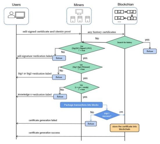 When a user registers a public key certificate on the blockchain, the self-signed certificate is passed along with an identity proof for verification by miners. The verification process is described in Figure 3. Once the certificates have been verified, they will be stored on the blockchain.