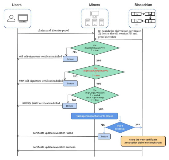 When users update or revoke the public key certificate, a claim, in the form of a new certificate, is passed along with the identity proof for verification. Examples of updating and revoking claims are shown in Figure 4. The red elements are unique to the updating process. Miners verify the signature using the old public key (PK1) of the certificate. After the verification of the old version of the signature is complete, the verification is performed with the new public key (PK2). Then, the miners verify the proof of identity as before. The new certificate is added to the distributed ledger after the verification. The verification process is described in Figure 5.