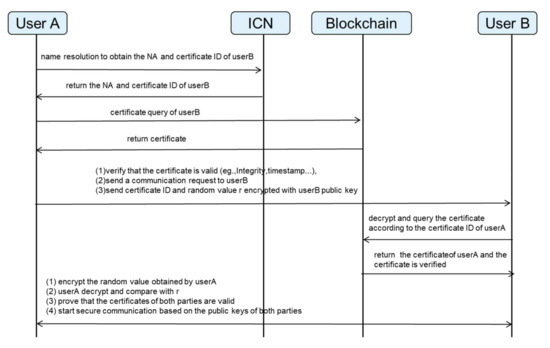 The secure communication process is illustrated in Figure 6. To be clear, our communication model is based on the architecture of standalone name resolution system [44,45,46], which is suitable for prototype systems such as DONA, Netlnf, etc. The designed ICN communication mode is a single handshake mode, so there is no three-handshake process of ACK before certificate exchange. In order to ensure security, after obtaining the network address through naming resolution, user A first queries and checks the certificate of user B according to the certificate ID in the decentralized PKI based on the blockchain. When the certificate is verified as correct, user A makes a communication request, encrypts and sends their certificate ID to the user B. Because the SNR system will not check the correctness of ID-NA registration, that is, if there are malicious users, it is not guaranteed that the ID-NA registered for content resources is a valid content link, and the certificate verification in advance can ensure that it will not be linked to the phishing address and be attacked. At the same time, the certificate ID needs to be registered with the user ID in the SNR system to provide anchoring and query services for the user ID and the corresponding certificate ID. During the initial interaction, there is no public key certificate between the communication parties. If the certificate ID is sent in clear text, the security of the information cannot be guaranteed. Therefore, SNR is responsible for issuing the certificate ID during the initial interaction. Here, user A represents the subscriber and user B represents the provider of services, which may be publishing or caching.