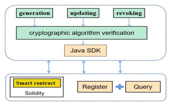 The experiments of our scheme are deployed based on an open-source blockchain platform called FISCO BCOS [47,48]. This platform includes many features, such as security, reliability and scalability. Our implementation consists of two parts. One is smart contract algorithms based on the blockchain. The smart contracts should implement basic functions consisting of registering transactions and retrieving data on the blockchain. The other is the implementation of verification functions for cryptography calculations which do not include smart contracts, such as proof and signature verification. The blockchain we chose features Java SDK, offering APIs for developers to program through the Java SDK, providing parameters for the smart contract and the calling of the functions implemented by smart contracts, which is shown as Figure 7. Therefore, we first used register and query smart contracts to implement the basic functions with respect to the blockchain and then wrote a Java application to complete the entire experiment as required.