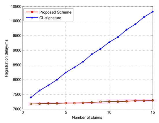 We first investigated the delay of the registration phase under the CL signature and our proposal. As presented in Figure 8, it is obvious that the verification of the CL signature takes longer, which delays the certificate registration. With an increase in the number of credential claims that need to be verified in verifiable presentations, the advantages of the Schnorr signature become clearer. On average, the proposed scheme saves about 20% in terms of the registration delay compared to the Cl signature in the context of multiple claim verification.