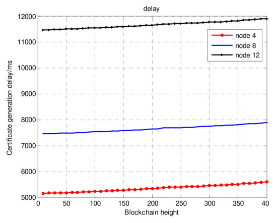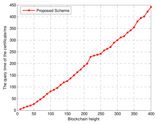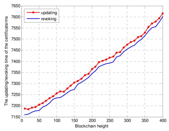 Finally, we focused on the query delay, updating delay and revoking delay of certificates. The number of consensus nodes was eight. Meanwhile, since the certificate query was based on the blockchain distributed database and the query will not have been concentrated on one node, we assumed that there would be no waiting delay by default. As shown in Figure 10, the query time for certificates increase rapidly along with the blockchain height. This is because the increase in data size of distributed ledger slows down the query traversal time, which may be a challenge faced by all blockchain-based decentralized PKIs. Therefore, the optimization of the certificate query delay will be discussed in detail in future research by our groups. Figure 11 shows the updating and revoking delays for certificates. Due to the influence of the query delay, the delays in terms of update and revocation were also longer.