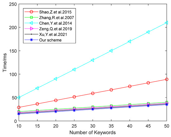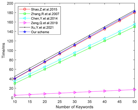 In order to visually show the comparison results, we conducted simulation experiments of the encryption algorithm and the test algorithm based on the PBC library. The experiment used a 64-bit Windows operating system, the processor was an Intel (R) Core (TM) i5-9500 CPU @ 3.00 GHz, and the running memory was 8 GB. We chose a type A elliptic curve, whose equation is and embedding degree is 2. The order q is a prime number of 512 bit. We selected SHA-1 as the hash function, and the bit length of the hash value was 160 bit. The specific experimental results are shown in Figure 3 and Figure 4.