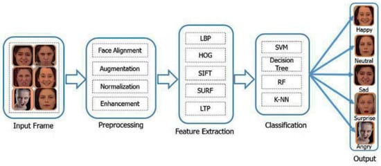 In contrast, the window-based method loses the capacity to view faces from various perspectives. Model matching approaches are the most frequently used techniques for FER, including face detection. In contrast, the window-based approach cannot view faces from different angles. Currently, several state-of-the-art classifiers, such as ANN, CNN, SVM, KNN, and random forest (RF), are employed for different features’ extraction and in the recognition of tumors in healthcare, in biometrics, in handwriting studies and in detecting faces for security measures [17,18,19].