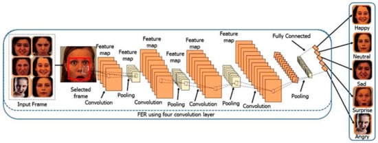 Deep learning (DL) algorithms have revolutionized the computer vision field in the current decade with RNN and CNN [41,42,43]. These DL-based methods are used for feature extraction, recognition and classification tasks. The key advantage of a DL approach (CNN) is to overcome the dependency on physics-based models and reduce the effort required in preprocessing and feature extraction phases [44,45]. In addition, DL methods enable end-to-end learning from input images directly. For these purposes, in several regions, including FER, scene awareness, face recognition and entity recognition, DL-based methods have obtained encouraging results from the state-of-the-art [46,47]. There are generally three layers in a DL-CNN, (1) convolution layer, (2) subsampling layer and (3) FC layer, as exhibited in Figure 2. The CNN takes the image or feature maps as the input, and slides these inputs together with a series of filter banks to produce feature maps that reflect the facial image’s spatial structure. Inside a feature map, the weights of convolutional filters are connected, and the feature map layer inputs are locally connected [48,49,50]. By implementing one of the most popular pooling approaches, i.e., max pooling, min pooling or average pooling, the second type of layer, called subsampling, is responsible for reducing the given feature maps [51,52]. A CNN architecture’s last FC layer calculates the class probability of an entire input image. Most DL-based techniques can be freely adapted with a CNN to detect emotions.