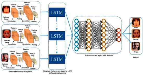 The hybrid CNN-RNN and CNN-LSTM techniques have comparable architectures, as discussed in the previous section and exhibited in Figure 3. In short, CNN-RNN’s simple architecture combines an LSTM with a DL software visual feature extractor, such as the CNN model. The hybrid techniques are, thus, equipped to distinguish emotions from image sequences. Figure 3 indicates that each graphic attribute has been translated to the LSTM blocks and describes a variable or fixed-length vector. Finally, performance is given for the prediction in a recurrent sequence learning module and the SoftMax classifier is used in [58].