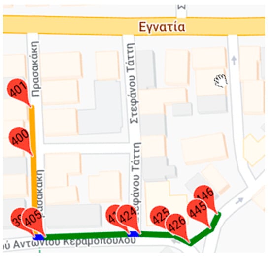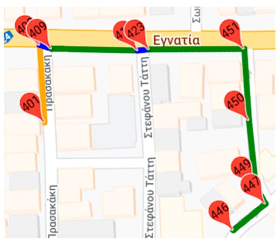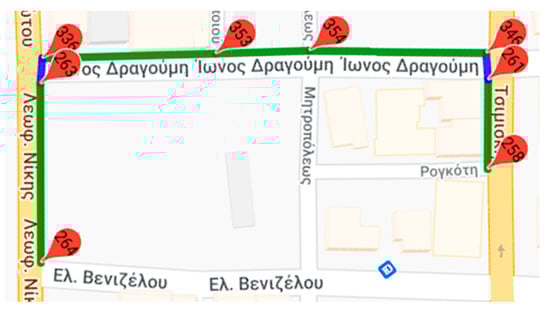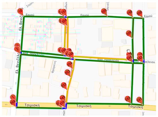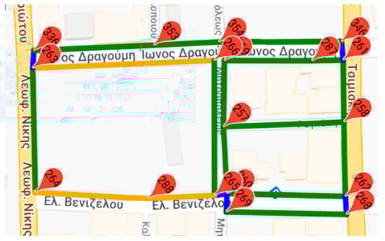 In the second use case (Figure 3), the transition from node 258 to node 264 is examined. As shown in Table 2, the shortest route passes through the following nodes—258, 257, 260, 265, 288, 264—and has a total length of 218.93 m (Figure 4). Moreover, in this use-case, a significant part of this route passes through sections that have been characterized as less accessible. Moreover, the sum of the total weights of each path can be calculated using Table A2.
