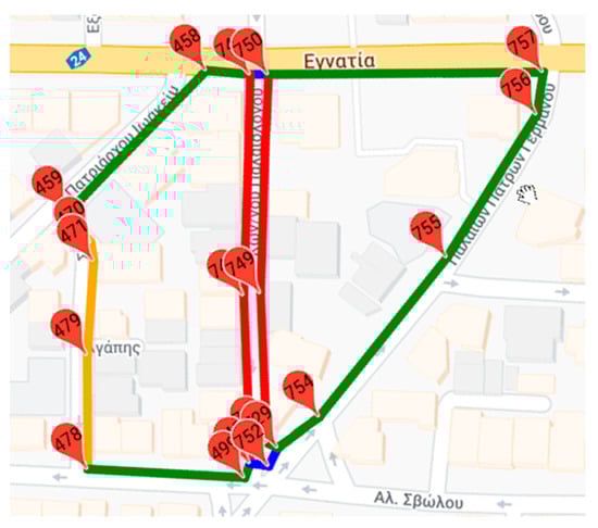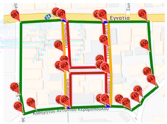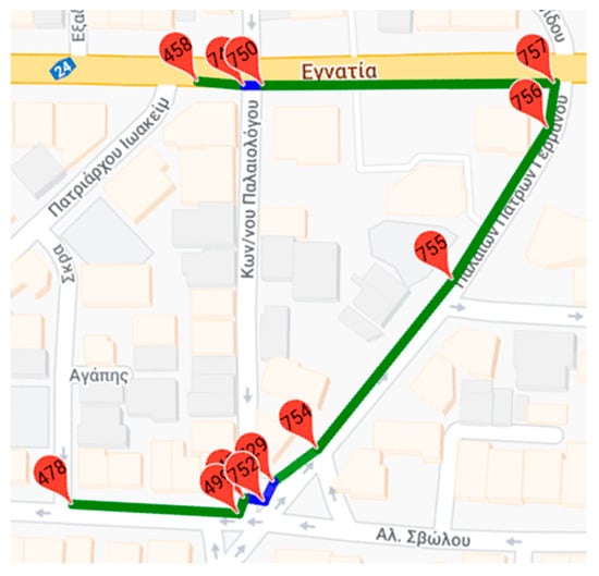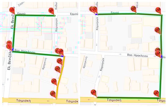 The application of the proposed algorithm for the seach of the most accessible route in the historic center of the city of Thessaloniki gave, in most cases, very good results, two of which are presented in this section. However, there were specific cases when the starting point or destination was within a less accessible section, where the results were not as expected. That was the reason for the correction of the penalty factor. In this section, we will first present two use cases where both versions of the algorithm worked as expected and then two use cases in which the initial version of the algorithm fails to provide acceptable results.
