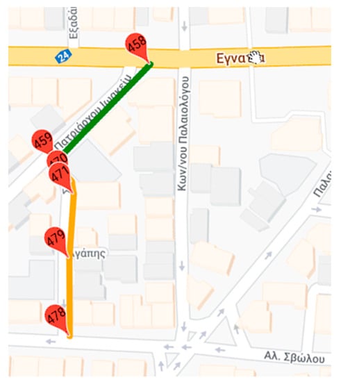 In the following figures, the graph nodes are shown with red markers. Within each marker, its ID is displayed. The accessible edges are represented in green, while the less accessible ones are represented in yellow. Finally, the crosswalks are marked in blue. In each of the following use-cases, the graph of the specific area is initially presented on the Google maps web service, followed by the shortest route between the source and the target node, as well as the most accessible of the ten alternatives paths. In addition, the last two use cases show the most accessible paths returned by both versions of the algorithm so that they can be compared. Finally, for each case, a corresponding table lists all the calculated weights of each of the k shortest routes. These tables show how the results shown in the figures below have been calculated.