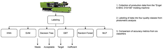 - A comparison of six ML techniques for quality prediction is provided. The tested techniques are K-nearest neighbor (KNN), decision tree, random forest, gradient-boosted trees (GBT), support vector machine (SVM), and multi-layer perceptron (MLP). The source code of the comparison is publicly available in a GitHub repository (https://github.com/airtlab/machine-learning-for-quality-prediction-in-plastic-injection-molding, accessed on the 15 May 2022);