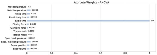 We evaluated the relevance of each feature on the class labels by scoring each feature according to the Relief algorithm [35] and the analysis of variance (ANOVA) method [36]. To this end, Figure 2 shows the feature scores computed with the Relief algorithm, normalized between 0 and 1. The feature with the highest score is the cycle time, i.e., the time to complete the molding process for a single sample. The filling time is the second-best feature, whereas the melt temperature and the specific back pressure have the lowest values.