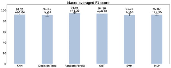 Figure 4 reports the scores of each classifier computed by macro-averaging the scores of each class. The average scores confirm the trend exhibited by the accuracy scores: the best classifiers are the random forest (94.95%) and the GBT (94.16%), with the latter obtaining a slightly lower standard deviation (0.98% against 1.23%). The other classifiers score a lower , with the KNN being the third best (92.21 ± 1.04%).