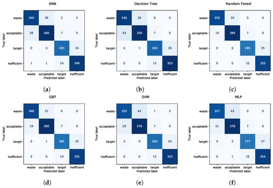 Confusion matrices collected by summing up all the test samples in the stratified 5-fold cross-validation scheme, for the six classifiers, i.e., KNN (a), decision tree (b), random forest (c), GBT (d), SVM (e), and MLP (f).