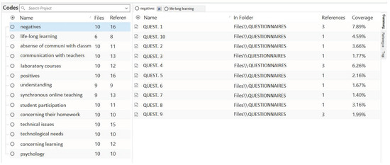 NVivo software was used to analyze the data. The qualitative study focused on categorizing the findings on the thematic analysis of the responses, on the correlation of the responses with the demographic data, and on the further interpretation of the findings. Each individual’s data were anonymized, and each participant was encoded with a tag from S1 to S10.