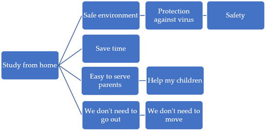 Further analysis of the data with NVivo software revealed interesting findings. More specifically, Figure 1 highlights the views of learners in relation to the opportunity they had to participate from home in online education (see Figure 2). By categorizing the answers, it turns out that there are four reasons why adult students consider that they benefit from the possibility of online course attendance: (a) they do not need to travel, (b) security against COVID-19 is ensured, (c) they save time, and (d) they can take care of their parents and children as adults with family responsibilities. Three out of five women were classified as those who had a positive view about online education, as opposed to men. Of these, S4 and S10, who had a family, found online education to be very helpful, as they had the opportunity to be at home and at the same time they could attend classes and supervise their family. Interestingly, the S4, who is employed, married and the oldest one of all states: “For me, the online education was good and very facilitating, since I have children, and also elderly parents to take care of at home”. On the contrary, the S7 had a particularly difficult time managing the family context, stating: “Everything has increased. Home lessons and family at the same time. For many hours we were all together and at the same time we all had obligations and needs. I would prefer to go back to school”.