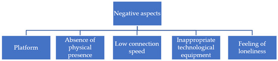 Another interesting finding from the NVivo analysis refers to the negative aspects presented in the participants responses. The most frequently appeared word was the word platform followed by the absence of physical presence, low connection speed, lack of appropriate technological equipment and feeling of loneliness (Figure 3).